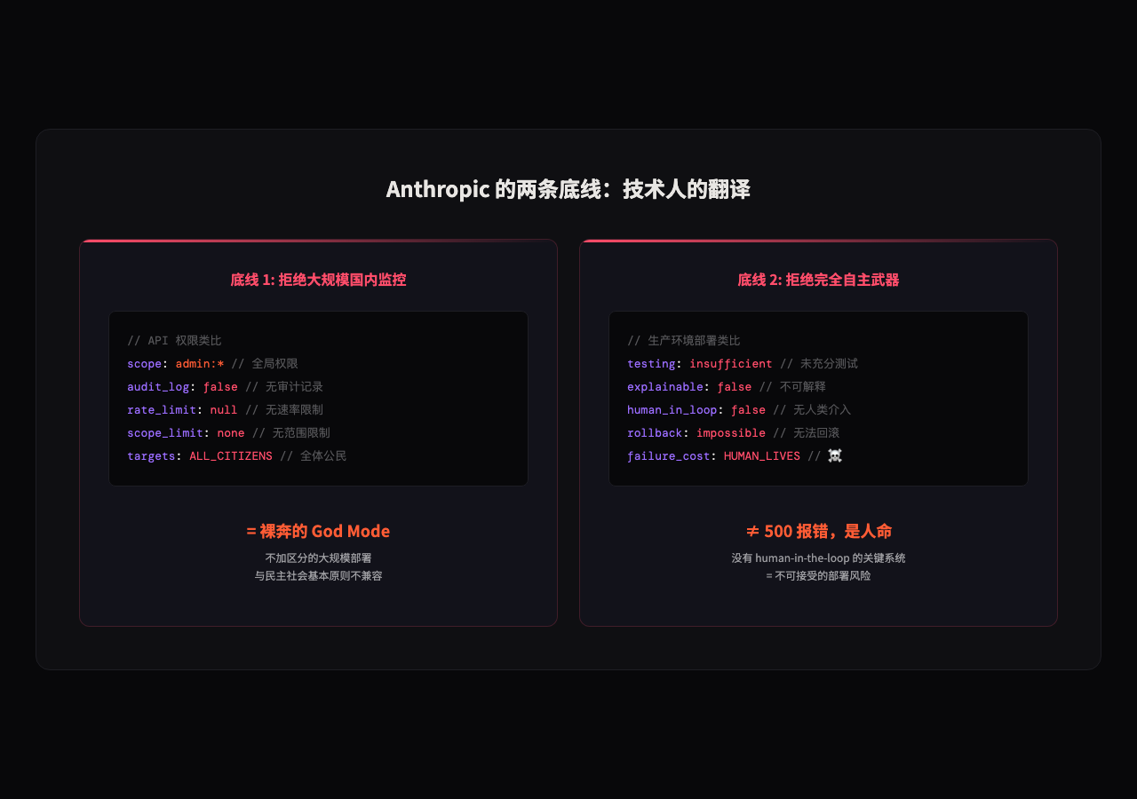 "AI 安全"这四个字听起来很抽象。但 Anthropic 画的这两条线,用工程师的语言翻译一下,其实非常具体。