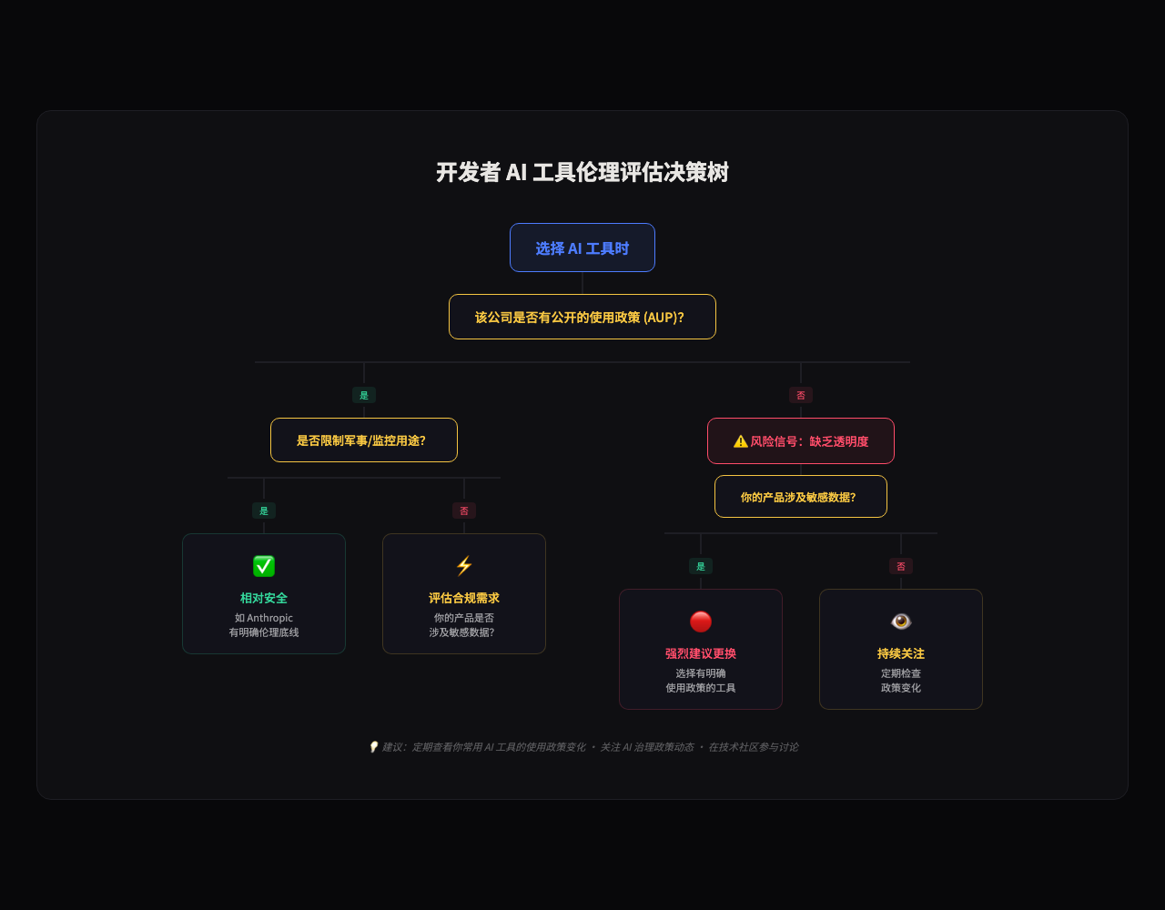 作为开发者,你至少可以做这些事:了解你常用的 AI 工具背后公司的使用政策;关注 AI 治理的政策动态;在技术社区参与讨论,而不是假装这些事和技术人无关。