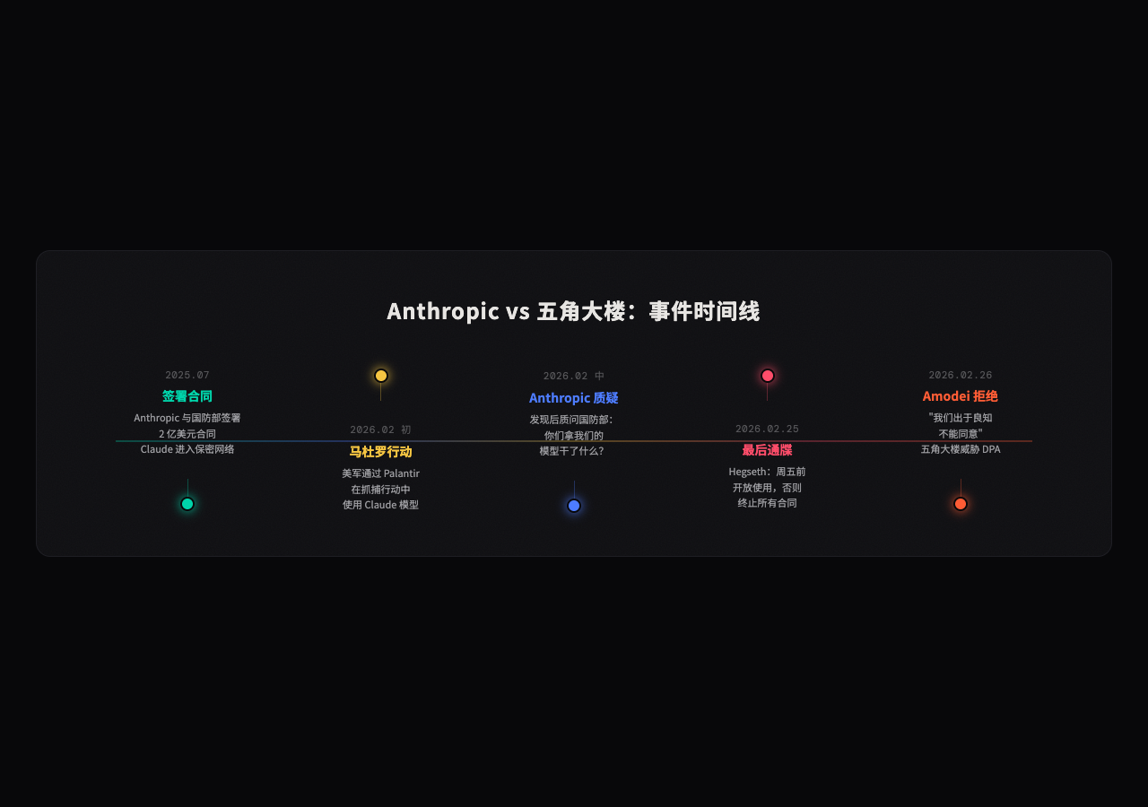 2025 年 7 月,Anthropic 和美国国防部签署了一份价值 2 亿美元的合同。Anthropic 成为第一家将 AI 模型部署到军方保密网络中的公司。注意,这不是什么象征性的握手合作——Claude 被直接塞进了军方的机密任务工作流里。