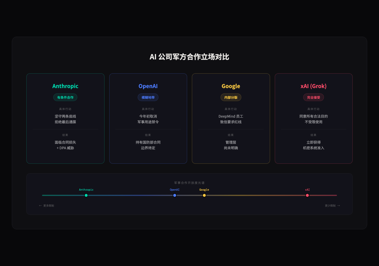 | Anthropic | 有条件合作 | 坚持两条底线,拒绝最后通牒 | 面临合同损失和 DPA 威胁 |